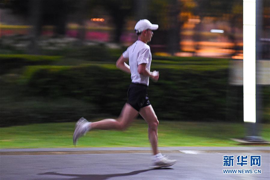 一位市民在海口萬綠園夜跑(5月28日拍攝)。近年來,夜跑成為越來越多都市人熱衷的健身方式之一。在海南海口,每當夜幕降臨,“夜跑族”來到海口萬綠園、世紀公園等夜跑場所跑步,用一身酣暢淋漓的汗水擺脫白天工作中的壓力,享受跑步帶來的歡愉。新華社記者 蒲曉旭 攝