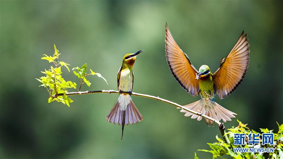 栗喉蜂虎在福建省晉江市深滬鎮科任村一山坡上覓食嬉戲(6月12日攝)。入夏以來,逾百只栗喉蜂虎飛臨閩南晉江市深滬鎮科任村筑巢棲息。新華社記者記者梅永存攝。