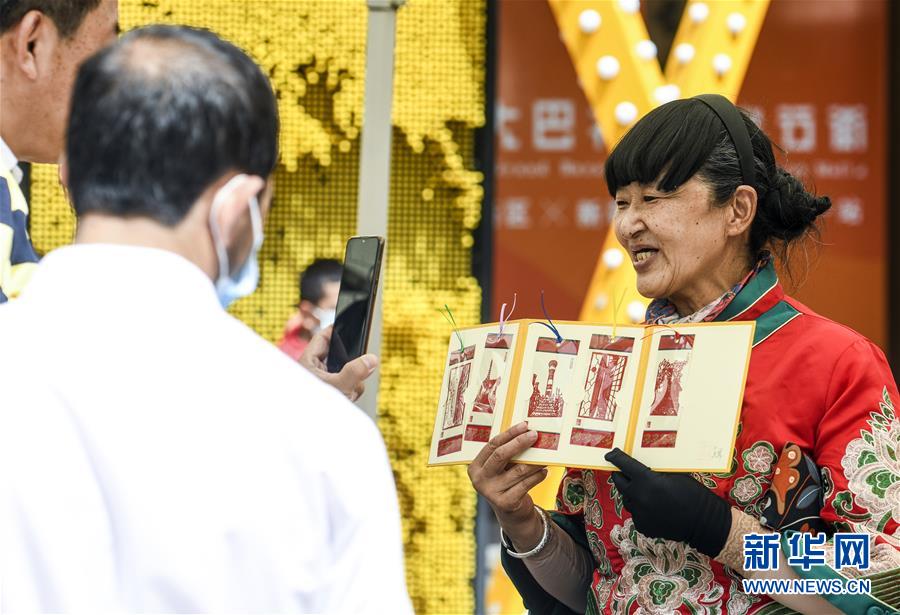 6月12日,在位于烏魯木齊大巴扎景區內的活動現場,手藝人、新疆剪紙技藝傳承人王革(右)向參觀者展示國家級非物質文化遺產——中國剪紙。6月12日,“文旅融合,文物賦彩,非遺傳承,健康生活”2020年烏魯木齊市天山區文化和自然遺產日推介展演活動在大巴扎景區舉辦,吸引不少游客和市民觀賞。新華社記者王菲攝。