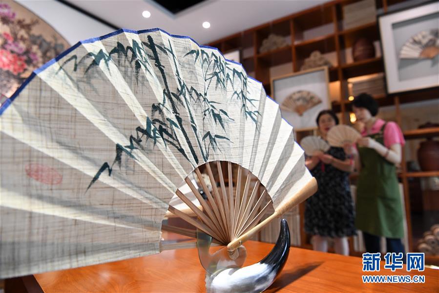 6月12日,非遺傳承人馬仁芬(左)與馬琳沁在探討夏布折扇的設計。新華社記者 唐奕 攝