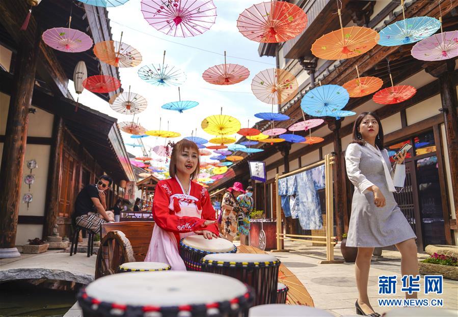 6月13日,在長春市世茂蓮花山小鎮(zhèn)寬厚里商街,一名古裝愛好者演奏手鼓。當(dāng)日是“文化和自然遺產(chǎn)日”。吉林長春首屆蓮花山消夏生活節(jié)在世茂蓮花山小鎮(zhèn)舉行。活動將非遺展示與假日消暑休閑相結(jié)合,讓游人在“古色古香”的油紙傘巷中品傳統(tǒng)文化魅力,享夏日休閑愜意。新華社記者 許暢 攝