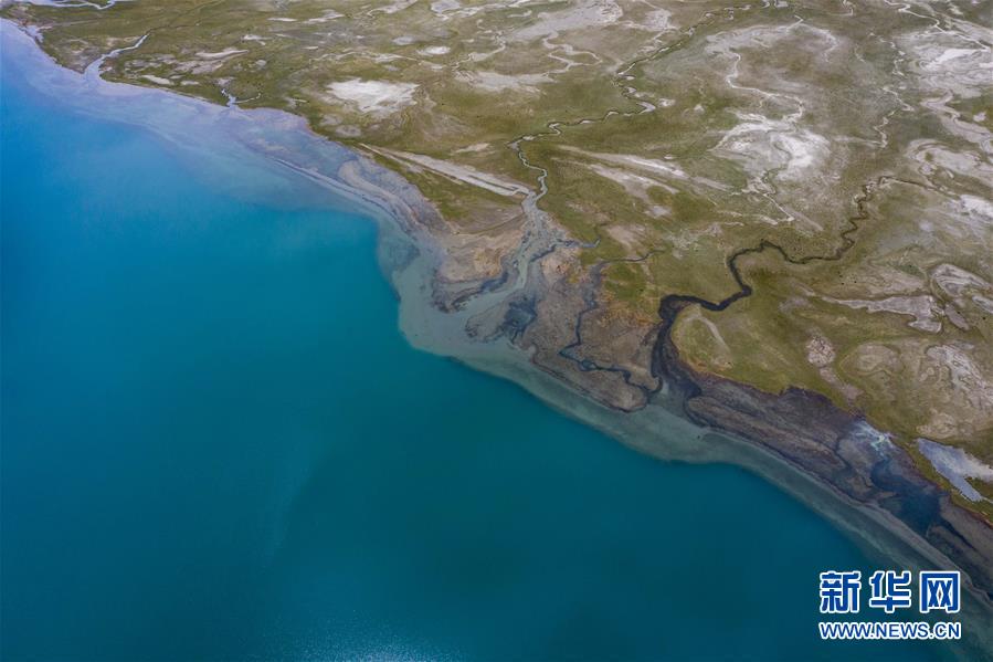 帕米爾高原上的喀拉庫勒湖及湖畔濕地一景(6月16日攝,無人機照片)。新華社記者 胡虎虎 攝