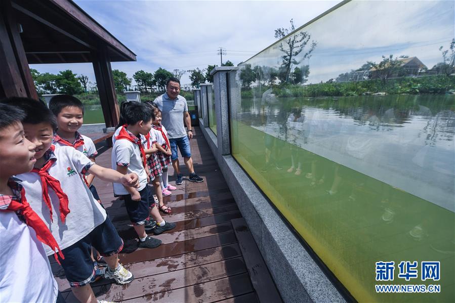6月17日,洛舍鎮中心學校的師生們參觀水情館的室外園區。新華社記者 徐昱 攝