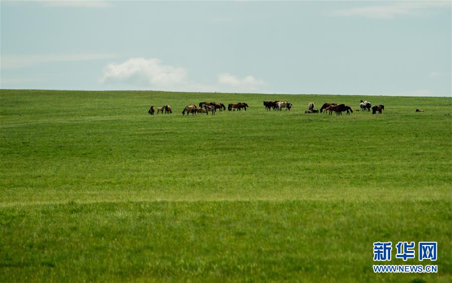 6月18日,馬群在錫林郭勒盟西烏珠穆沁草原上吃草。初夏時節,內蒙古中部的錫林郭勒大草原風景如畫。新華社記者連振攝