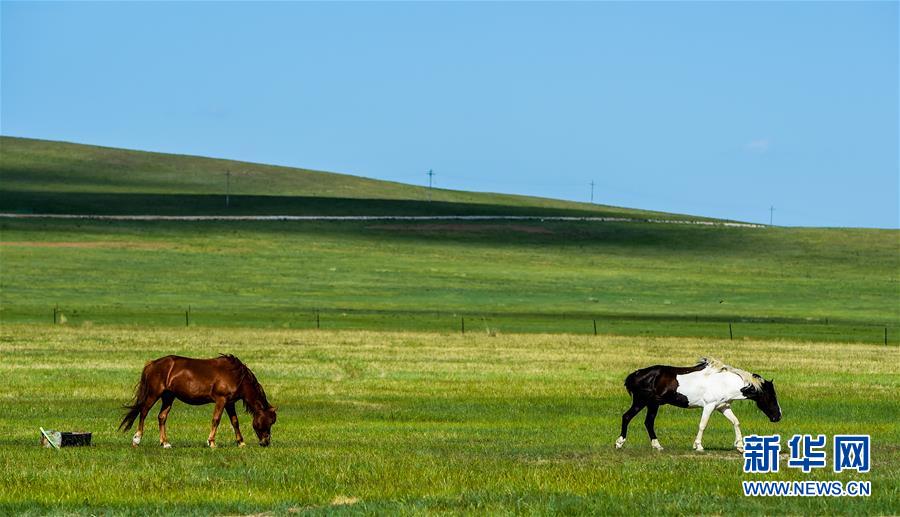 6月17日,馬兒在錫林郭勒盟烏拉蓋草原上吃草。初夏時節,內蒙古中部的錫林郭勒大草原風景如畫。新華社記者連振攝