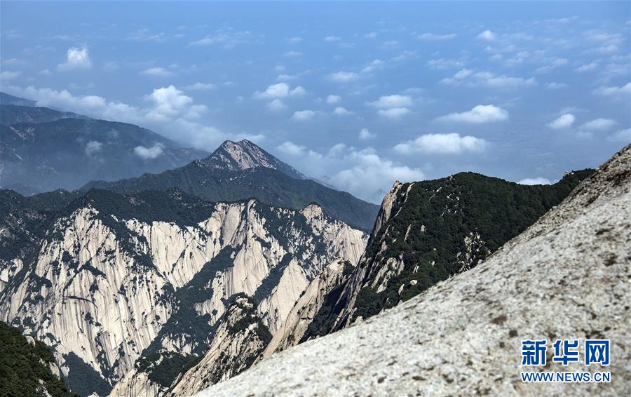 6月18日,白云飄動下的華山。當日,西岳華山經歷連續三天暴雨后,迎來燦爛的陽光。新華社記者 陶明 攝