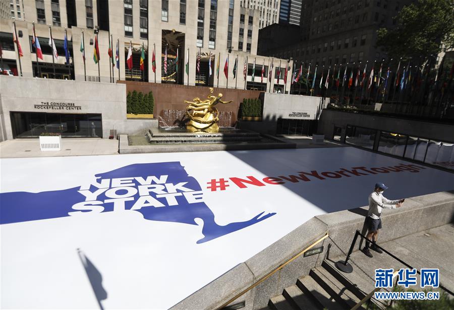 6月22日,在美國紐約洛克菲勒中心,一名男子在寫有“紐約堅強”字樣的廣場自拍。美國約翰斯·霍普金斯大學(xué)22日發(fā)布的新冠疫情最新統(tǒng)計數(shù)據(jù)顯示,美國累計死亡病例超過12萬例。新華社記者王迎攝