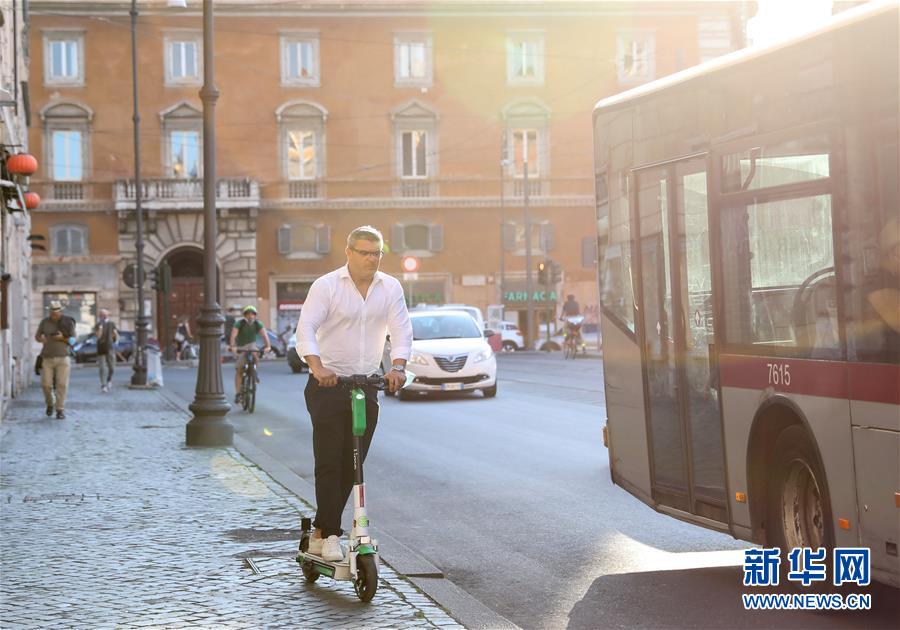 6月23日,在意大利首都羅馬,一名男子騎著電動踏板車在城市中穿行。新華社記者程婷婷攝