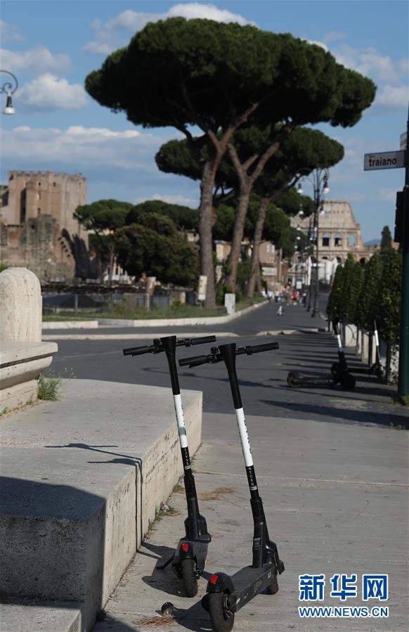 6月23日,在意大利首都羅馬,街頭停放著共享電動踏板車。新華社記者程婷婷攝
