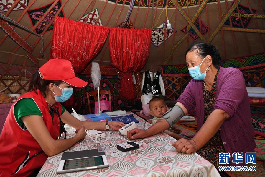 新疆布爾津縣也格孜托別鄉醫生布勒布勒古麗·金恩斯汗(左)給牧民檢查身體。新華社記者沙達提攝