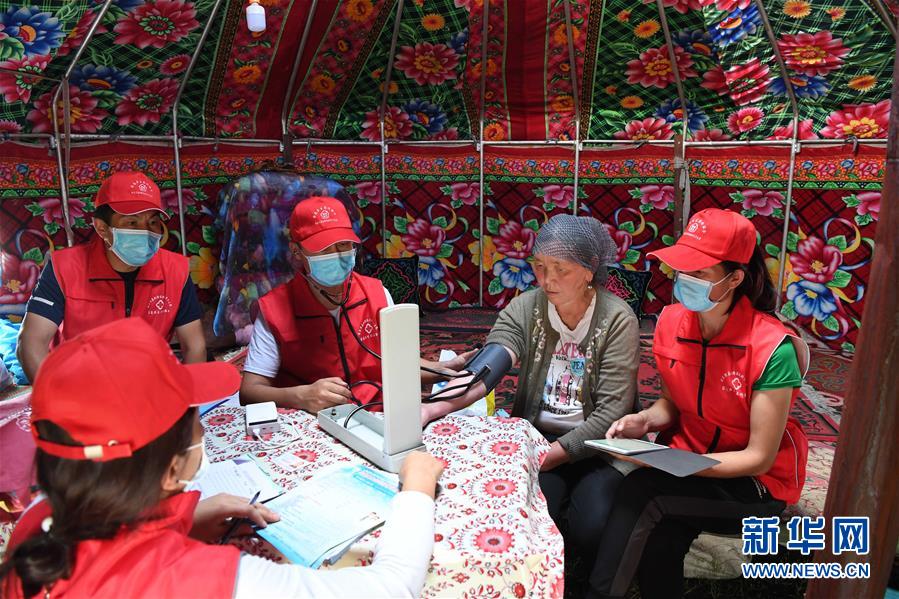 新疆布爾津縣也格孜托別鄉衛生院全科醫生哈納提別克·沙旦(右三)給牧民巴合提古麗·塔拉甫汗檢查身體。新華社記者沙達提攝