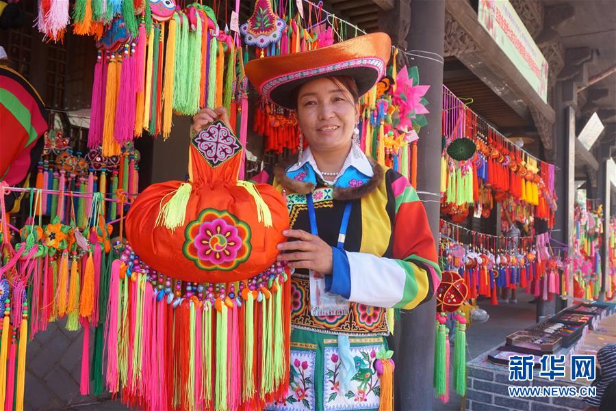 6月24日,繡娘胡蘭索卡在青海省互助土族自治縣舉辦的端午節香包“選美”大賽上展示她的作品。新華社記者解統強攝
