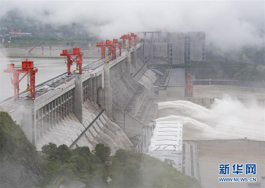 6月29日,三峽樞紐開啟泄洪孔泄洪。受長江中上游強降雨影響,進入三峽水庫的水量持續增多。為騰出一定庫容迎接近期可能到來的洪水,三峽樞紐于6月29日上午開啟兩個泄洪孔,加大下泄流量。這是三峽樞紐今年首次泄洪。28日14時,三峽水庫入庫流量達4萬立方米/秒,是27日14時的兩倍。為應對此輪來水,長江防總要求將三峽水庫下泄流量上調至日均3.5萬立方米/秒。新華社發(黃善軍攝)