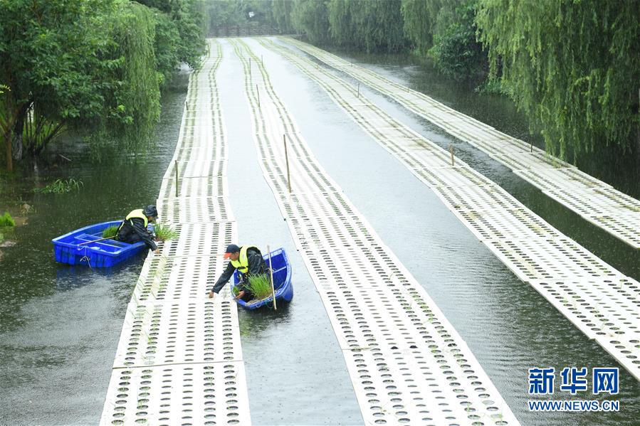 6月29日,工作人員在吳興區湖東街道的“水上稻田”插秧。今年以來,浙江湖州吳興區湖東街道開始在轄區河道大規模推廣“水上稻田”新型農業項目,利用浮島進行特種水稻種植,既能凈化水體,又能產出生態稻谷。“水上稻田”預計在11月實現收割。新華社記者翁忻旸攝