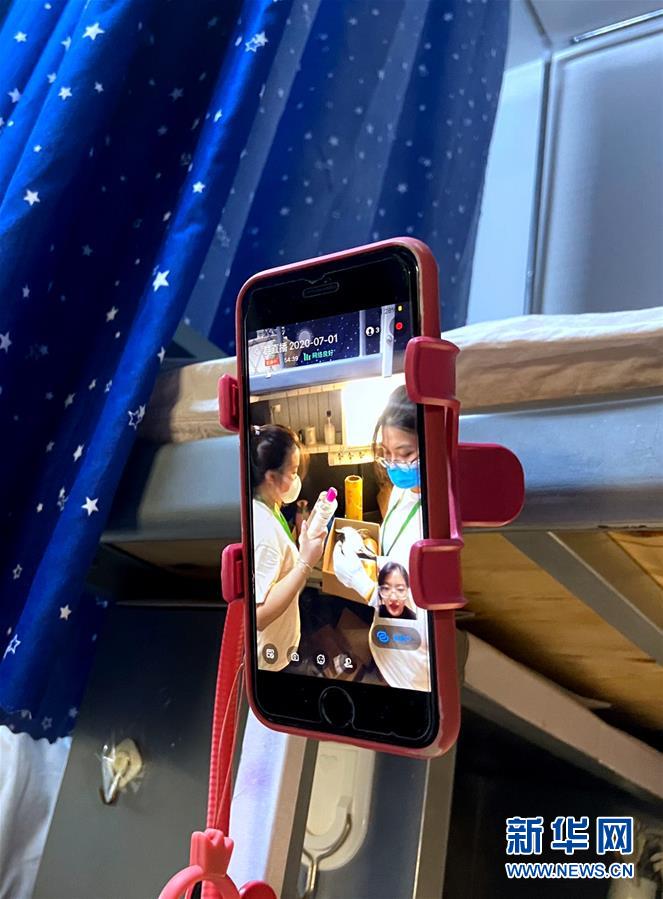 7月1日,在北理工學生宿舍,輔導員通過手機視頻方式,核對畢業生的個人物品。6月29日起,北京理工大學教職員工開始為2020屆6000多名需要打包的畢業生集中進行行李打包、郵寄和留置物品存放工作。經過提前與畢業生“一對一”溝通,老師們耐心細致地通過手機“直播”打包行李的全過程,與每一個同學認真核對其個人物品,細心收納擺放、整理密封、搬運寄送,讓不能返校的畢業生們安心、放心。新華社記者魏夢佳攝
