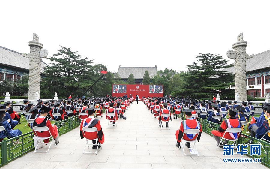 7月2日拍攝的北京大學2020年畢業典禮辦公樓西側廣場會場。當日,北京大學舉行2020年畢業典禮。由于疫情防控需要,今年的典禮在北京大學辦公樓西側廣場、靜園草坪、未名湖等九個會場舉行,并面向全球進行中英文雙語直播,僅部分在校畢業生現場參加,更多畢業生通過線上直播參與畢業典禮。新華社記者任超攝