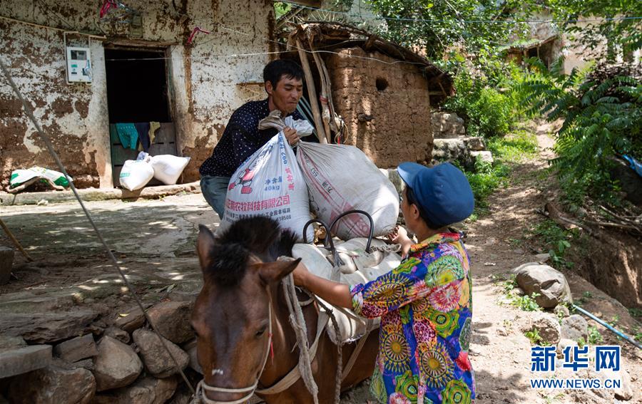 且沙次干把兩袋谷物放在馬背上(6月27日攝)。當日,且沙次干和妻子阿達么日雜把老房子里的糧食、家什等收拾一番,準備搬進村集中安置點的新居。新華社記者 江宏景 攝