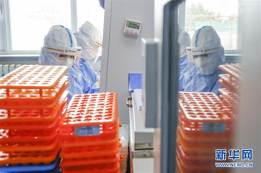 7月3日,中日友好醫院檢驗科新冠核酸檢測實驗室的檢驗人員閆克芹和張鑫(左)在實驗室內處理剛剛送到的樣本。新華社記者張玉薇攝