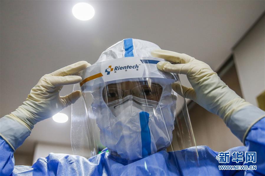7月3日,中日友好醫院檢驗科新冠核酸檢測實驗室的檢驗人員閆克芹在進入污染區前穿戴防護裝備。新華社記者張玉薇攝