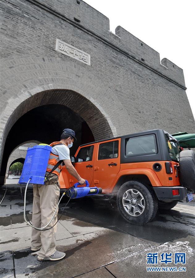 7月4日,防疫人員對進入宛平古城的車輛進行消毒。當日,北京市豐臺區組織防疫人員、安全監察部門人員對社區、超市、公共場所進行大規模環境消毒及疫情隱患排查,全力保障市民生活和工作環境安全。新華社記者 李欣 攝