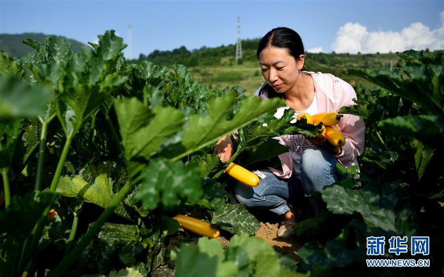 在陜西太白縣咀頭鎮咀頭街村供港蔬菜示范基地內,工作人員在采摘香蕉葫蘆(7月4日攝)。新華社記者劉瀟攝