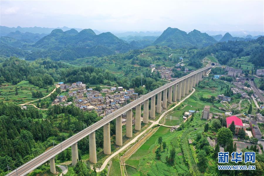 7月6日拍攝的安六鐵路岱港村特大橋(無人機照片)。當日,新建貴州安六鐵路(安順至六盤水)聯調聯試工作進入收尾階段,開通前的各項準備工作已基本就緒。安六鐵路線路全長約125公里,設計時速250公里,為國家I級雙線客運專線。建成投用后,貴陽至六盤水的鐵路旅行時間可從現在的3.5小時縮短為1小時左右,貴州省六盤水市將全面接入全國高鐵網。新華社記者劉續攝