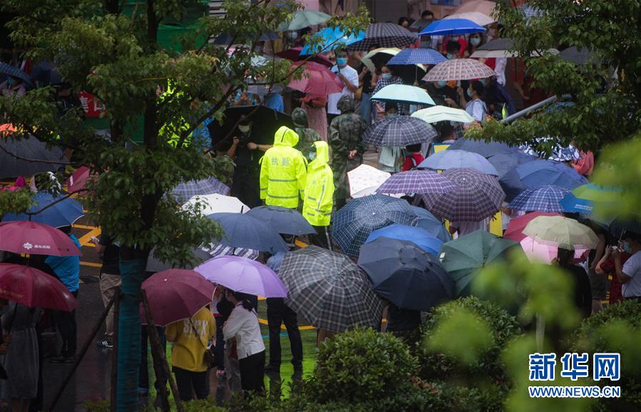 7月7日,在湖北省武漢市東湖中學考點外,民警在雨中執勤。當日,2020年高考拉開帷幕。新華社記者肖藝九攝