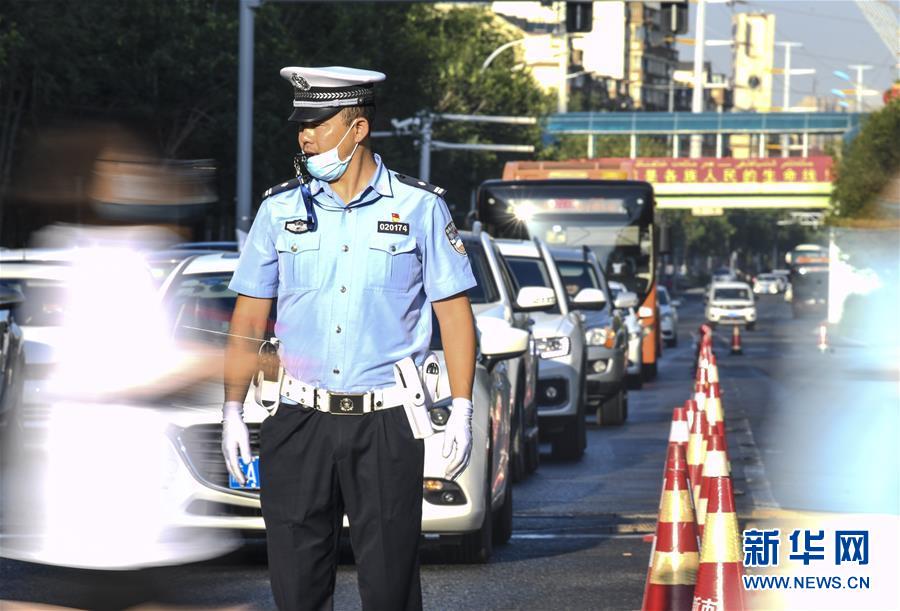 7月7日,在烏魯木齊市第六十八中學考點外,烏魯木齊市公安局交通警察支隊新市區大隊阿勒泰路中隊中隊長謝建明在引導考生通過馬路。當日,2020年高考拉開帷幕。新華社記者王菲攝