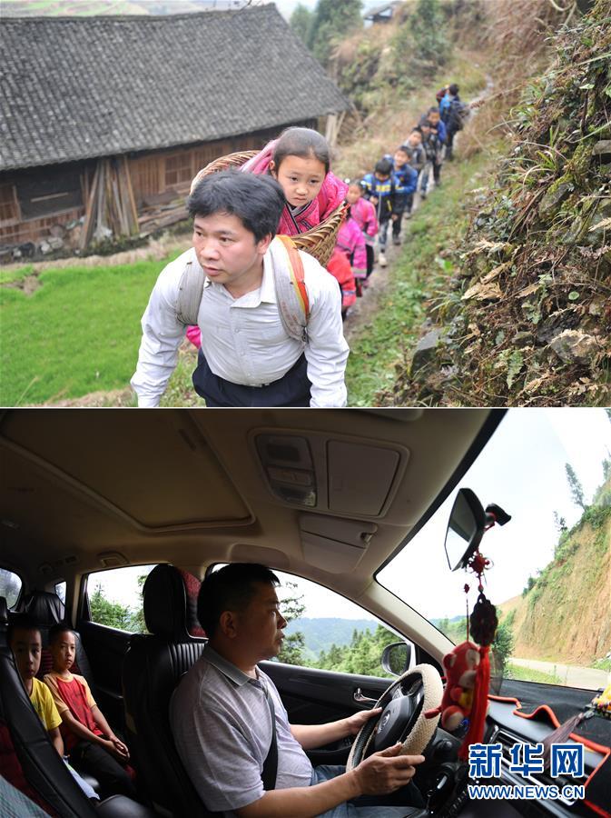 這是一張拼版照片,上圖:在廣西龍勝龍脊鎮江柳村,余啟貴老師在放學路上將一個走不動了的孩子背在背簍里,領著其他孩子一起回家(2013年2月26日攝);下圖:在廣西龍勝龍脊鎮江柳村,余啟貴老師開著自己的汽車帶著學生去學校(7月7日攝)。新華社記者陸波岸攝