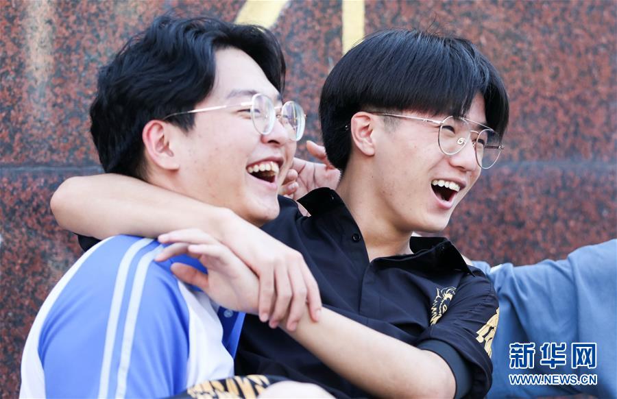 7月8日,在吉林省長春市第八中學考點門口,考生慶祝高考結束。當日,全國部分地區2020年高考結束。新華社發(顏麟蘊攝)