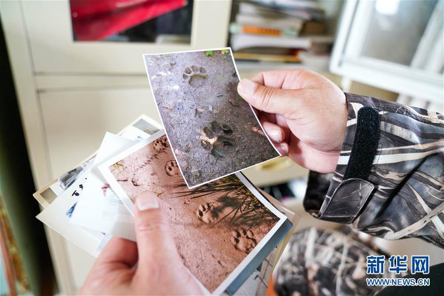 董紅雨在家中向記者展示自己拍攝的野生東北虎足跡照片(7月8日攝)。新華社記者王松攝