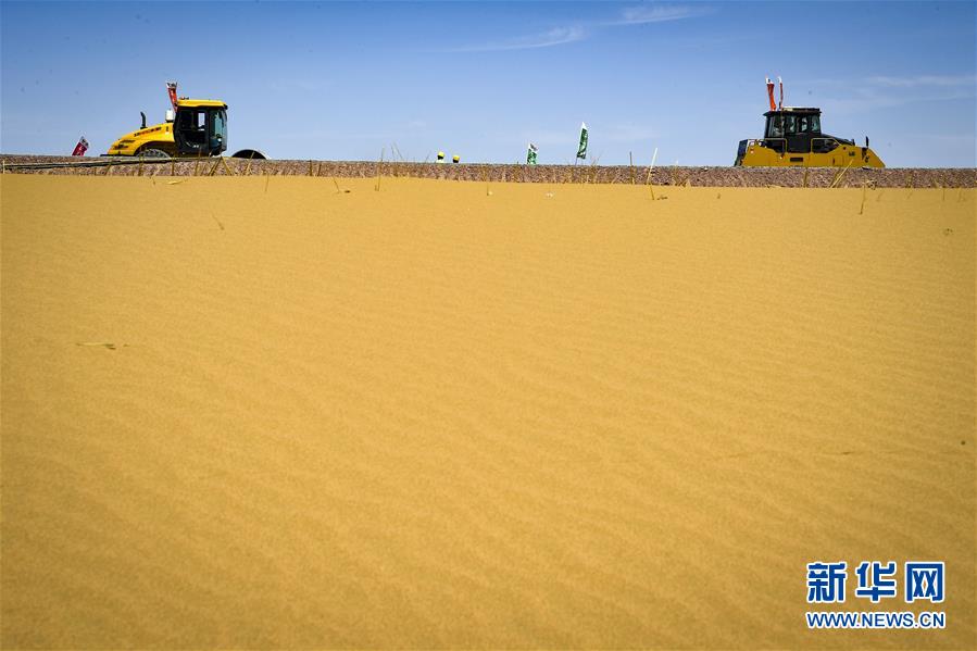 7月10日,工人在位于寧夏境內的烏瑪高速青銅峽至中衛段A10標段施工。盛夏時節,位于寧夏境內的烏瑪(內蒙古烏海市至青海瑪沁縣)高速青銅峽至中衛段正在抓緊施工建設。該路段主線全長122.9公里,其中穿越騰格里沙漠腹地的18公里公路是寧夏建設的首條沙漠高速公路,預計2021年建成通車。新華社記者馮開華攝。