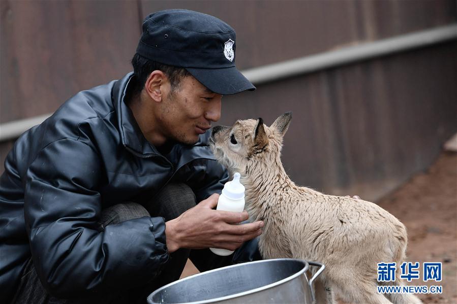7月7日,三江源國家公園管理局長江源園區可可西里管理處卓乃湖保護站的工作人員才文多杰在給藏羚羊幼仔喂奶。