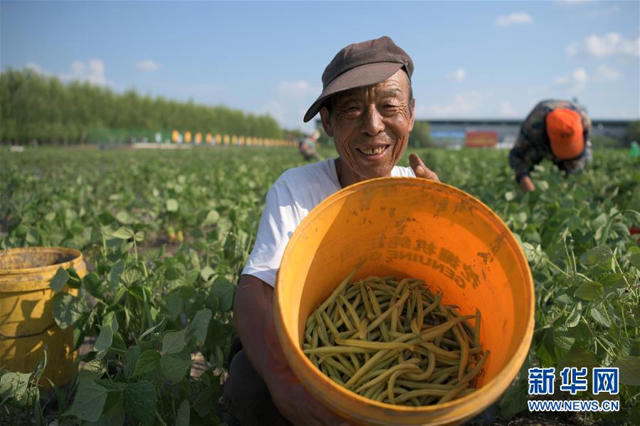 7月14日,在克東縣昌盛鄉青刀豆蔬菜種植示范基地,昌盛鄉安全村脫貧戶丁紹興展示剛摘下的青刀豆。黑龍江省克東縣地處大興安嶺南麓,近年來,當地大力發展扶貧產業,探索“小院經濟”、訂單種植和加工產業相融合新方式,帶動農民就業和脫貧增收。新華社記者 王建威 攝