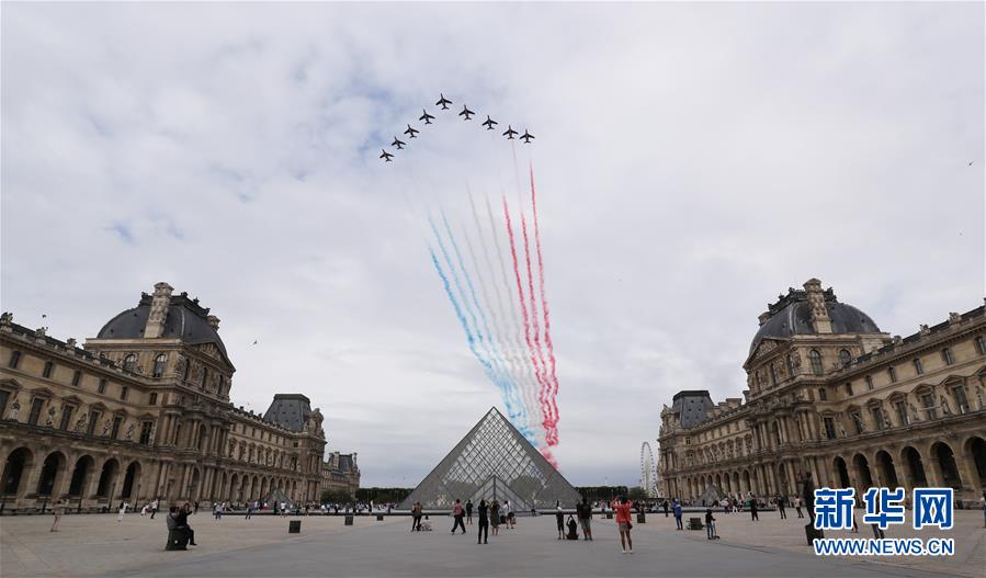 7月14日,“法蘭西巡邏兵”飛行表演隊飛過法國巴黎盧浮宮玻璃金字塔廣場。法國一年一度的國慶閱兵式14日在巴黎舉行。受疫情影響,法國總統馬克龍沒有在香榭麗舍大街舉行國慶閱兵式,而是在協和廣場舉行小型慶祝儀式,向在抗疫斗爭中做出貢獻的公民致敬。新華社記者高靜攝