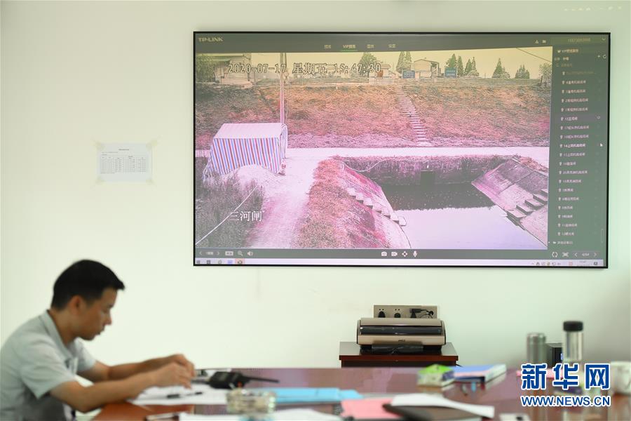 7月17日,在岳陽(yáng)市華容縣治河渡鎮(zhèn)防汛抗旱指揮所,大屏實(shí)時(shí)顯示新華垸三門閘附近情況。為力爭(zhēng)安全度汛,湖南省岳陽(yáng)市華容縣織密人防、物防、技防“三防”網(wǎng)絡(luò),加強(qiáng)應(yīng)急值守和巡查排險(xiǎn)工作,采取“以船代倉(cāng)”“以車代倉(cāng)”等多種方式靈活儲(chǔ)備防汛物資,在險(xiǎn)工險(xiǎn)段布置攝像頭實(shí)時(shí)監(jiān)控,利用無人機(jī)對(duì)人員難以到達(dá)的位置進(jìn)行巡查。新華社記者陳澤國(guó)攝