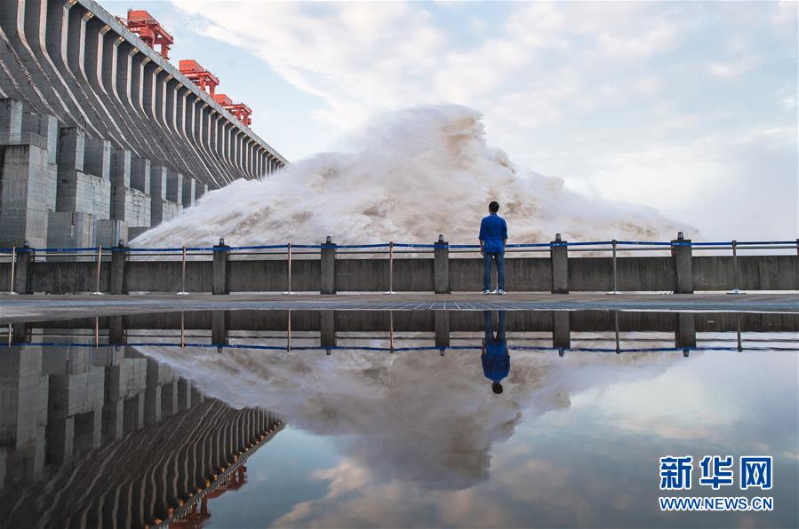 7月19日,工作人員在三峽樞紐前巡查。19日20時,三峽水庫入庫流量4.6萬立方米/秒,較本輪洪水的峰值6.1萬立方米/秒下降了1.5萬立方米/秒?!伴L江2020年第2號洪水”平穩通過三峽大壩。新華社記者肖藝九攝