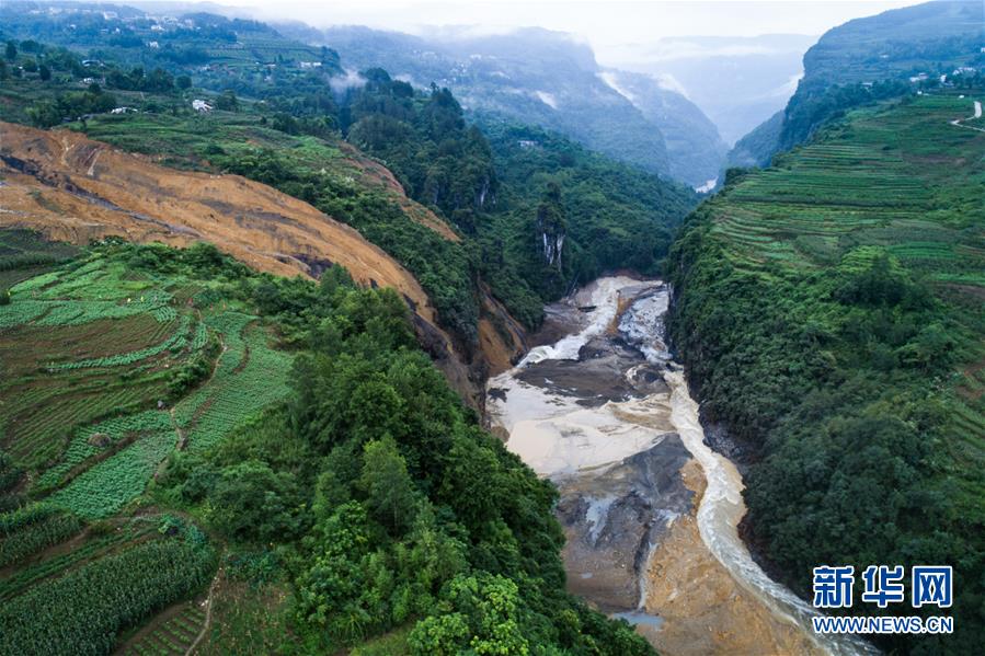 7月22日拍攝的因恩施州屯堡鄉馬者村山體滑坡形成的堰塞湖(無人機照片)。新華社記者肖藝九攝