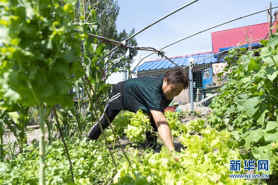 7月23日,在黑龍江省撫遠市濃橋鎮東方紅村,康麗艷在自家庭院中摘菜。新華社記者 謝劍飛 攝