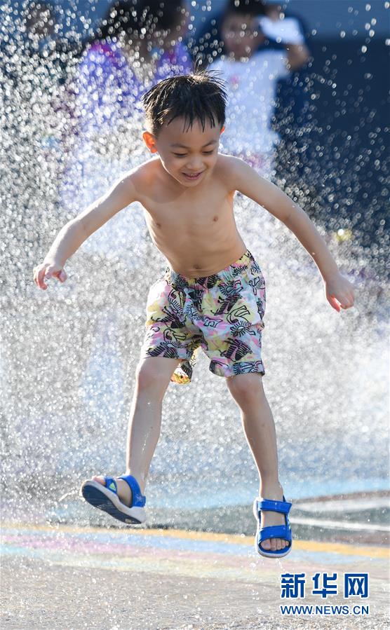 7月24日,一名小男孩在北京華熙LIVE·五棵松商業街區的一處噴泉戲水。北京市氣象局7月24日傍晚發布稱,24日截至16時30分,平原大部分地區出現37℃以上高溫天氣,局地氣溫超過40℃。北京市已于23日發布高溫藍色預警,預計25日全市大部分地區日最高氣溫仍將達35℃以上。新華社記者陳曄華攝