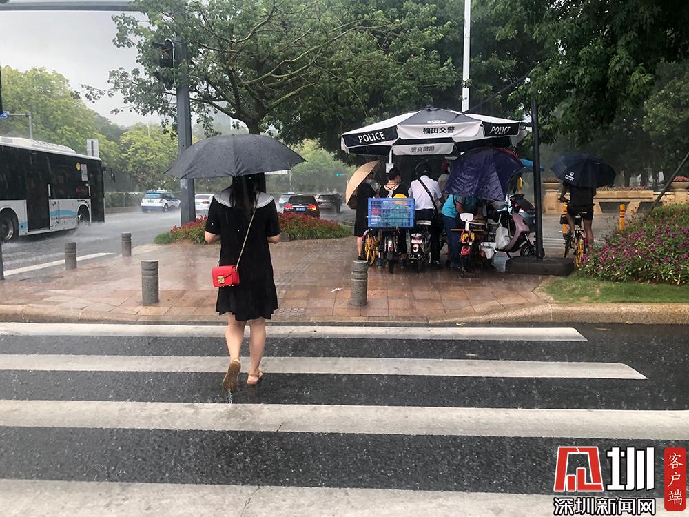 雨勢較大,市民紛紛躲在交警執勤使用的雨傘下避雨。