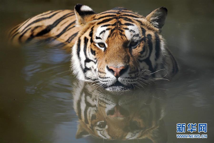 7月28日,在橫道河子東北虎林園,東北虎在水中納涼。時值盛夏,位于黑龍江省海林市的橫道河子東北虎林園的東北虎活動量減少,以不同方式消夏納涼。新華社記者王建威攝