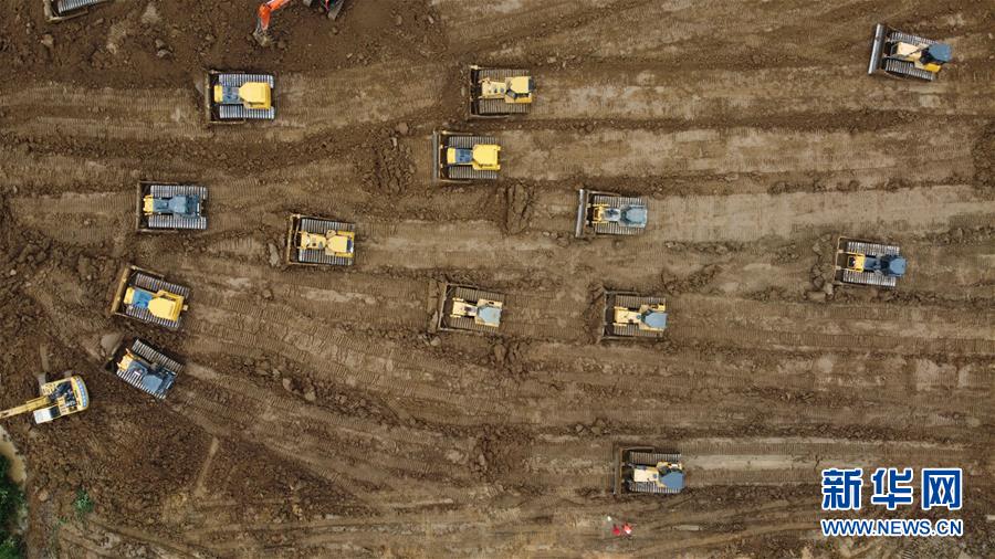 7月28日,在姜唐湖蓄洪區戴家湖一處涵閘險情處置現場,人們操作機械設備在搶筑臨時圩堤(無人機照片)。新華社記者黃博涵攝