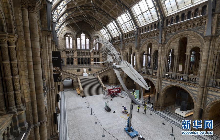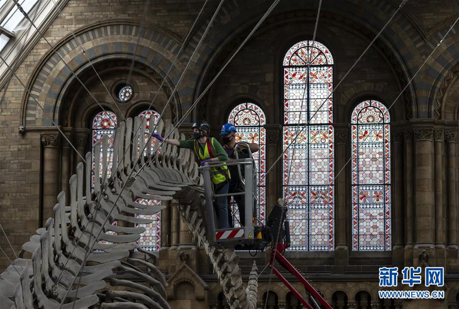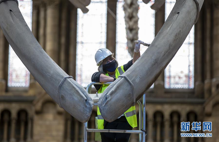 7月27日,一名工作人員在英國(guó)倫敦的自然歷史博物館大廳內(nèi)清潔一具藍(lán)鯨骨架。受新冠疫情影響關(guān)閉數(shù)月的英國(guó)自然歷史博物館將于8月5日重新對(duì)外開(kāi)放,目前館方正在為重新開(kāi)放做最后準(zhǔn)備。參觀者需要提前預(yù)約參觀時(shí)段、全程佩戴口罩且保持安全距離。新華社記者韓巖攝