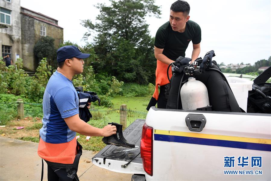 7月24日,在安徽省廬江縣臺創園小南河段,吳正寶(左)和徐宏林準備潛水。新華社記者劉軍喜攝