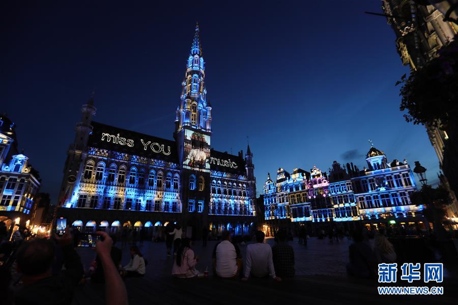 7月29日,人們?cè)诒壤麜r(shí)布魯塞爾大廣場(chǎng)欣賞聲光秀,市政廳外墻上投射出“想念你,音樂(lè)”的字樣。7月29日,比利時(shí)布魯塞爾大廣場(chǎng)舉行大型聲光秀。藝術(shù)家在市政廳等歷史建筑上投影文字和圖案,紀(jì)念這個(gè)夏天受新冠疫情影響而不能如期舉辦的文化活動(dòng)。新華社記者鄭煥松攝