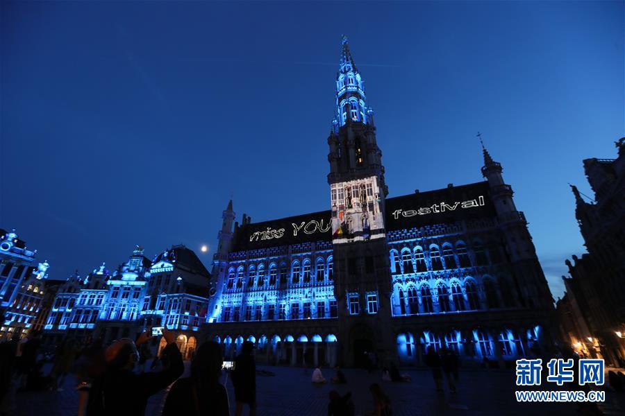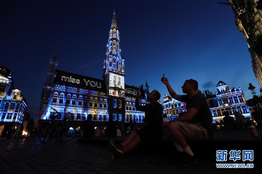 7月29日,比利時布魯塞爾大廣場的市政廳外墻上投射出“想念你,節(jié)日”的字樣。7月29日,比利時布魯塞爾大廣場舉行大型聲光秀。藝術(shù)家在市政廳等歷史建筑上投影文字和圖案,紀念這個夏天受新冠疫情影響而不能如期舉辦的文化活動。新華社記者鄭煥松攝