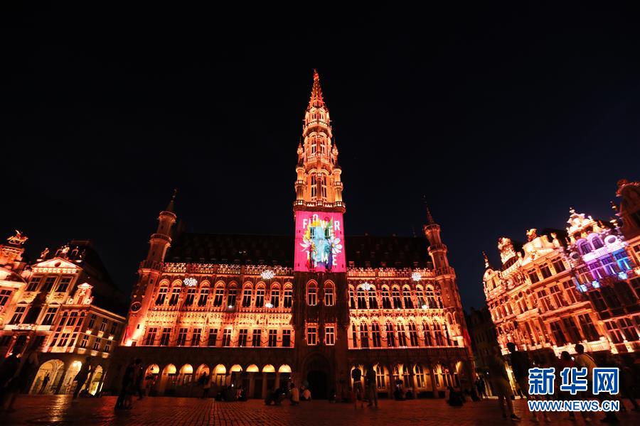 7月29日,人們在比利時布魯塞爾大廣場欣賞聲光秀。7月29日,比利時布魯塞爾大廣場舉行大型聲光秀。藝術(shù)家在市政廳等歷史建筑上投影文字和圖案,紀念這個夏天受新冠疫情影響而不能如期舉辦的文化活動。新華社記者鄭煥松攝