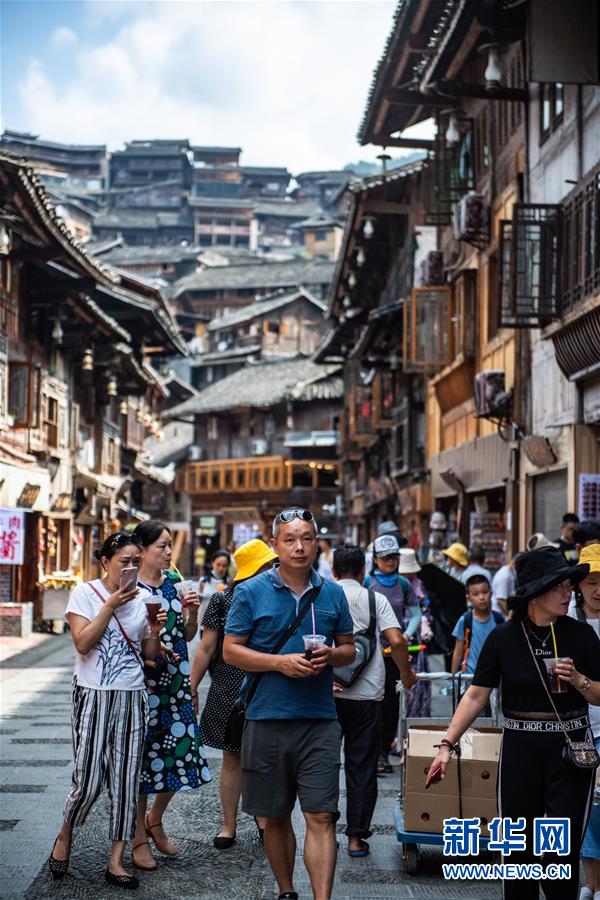 游客在貴州省雷山縣西江千戶苗寨景區內游玩(7月31日攝)。新華社記者陶亮攝