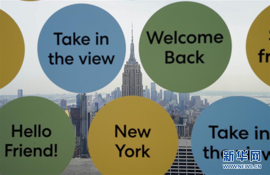 8月6日,在美國紐約,人們在洛克菲勒中心觀景臺上觀看城市景觀。當日,3月份暫時關閉的洛克菲勒中心觀景臺恢復對公眾開放。每天13時至21時,人們可戴口罩前往參觀。新華社記者王迎攝